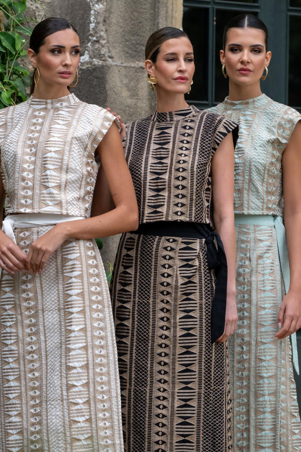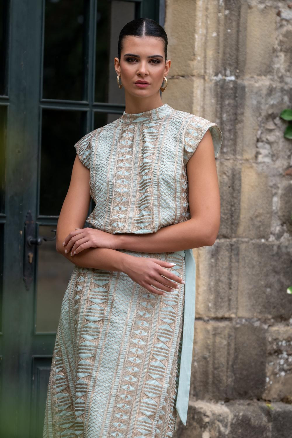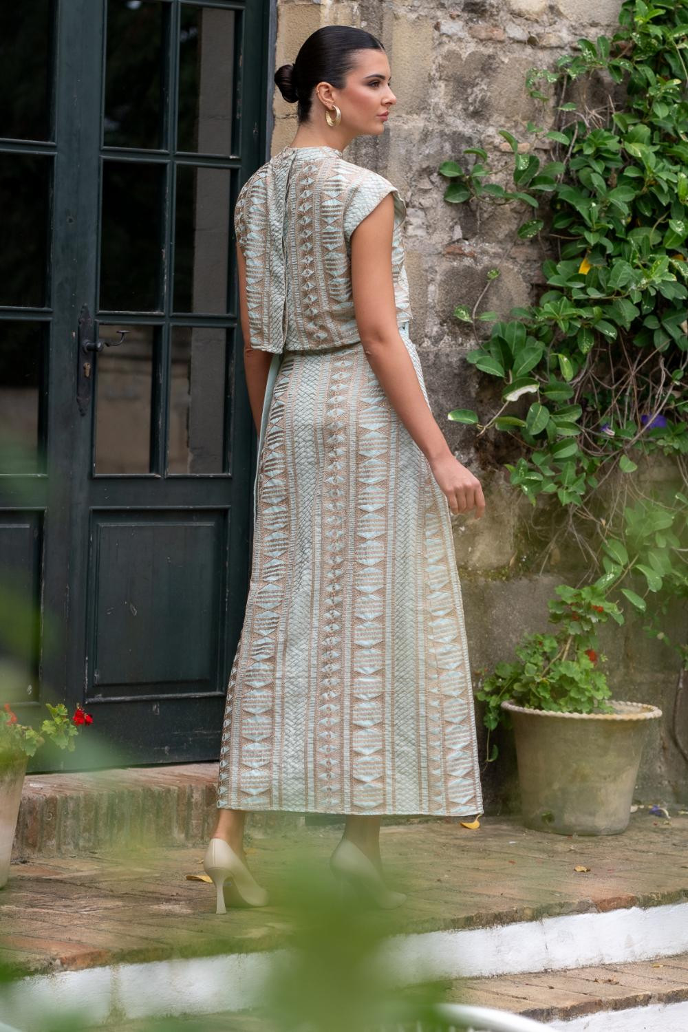 Falda aqua abierta Pareo atada en cintura, con Tejido bordado geométrico en hilo metálico bronce.