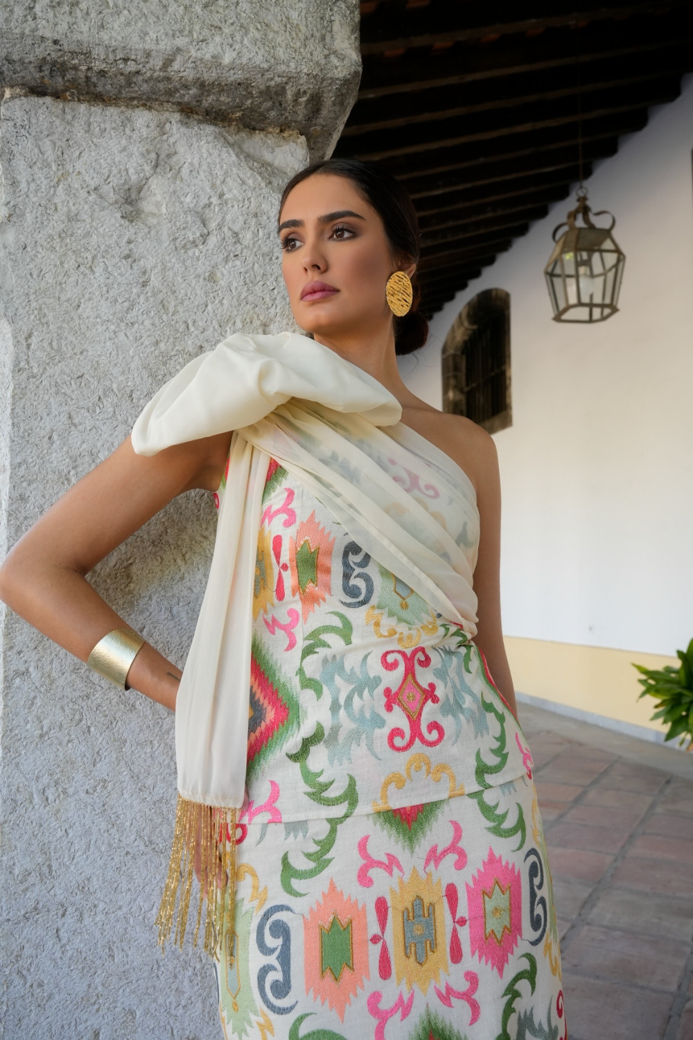 Top Mariposa etnico asimetrico con tejido de gasa lisa beige en el hombro beige Kahyra. COMPOSICIÓN: 100% POLIÉSTER FORRO: 100% POLIÉSTER