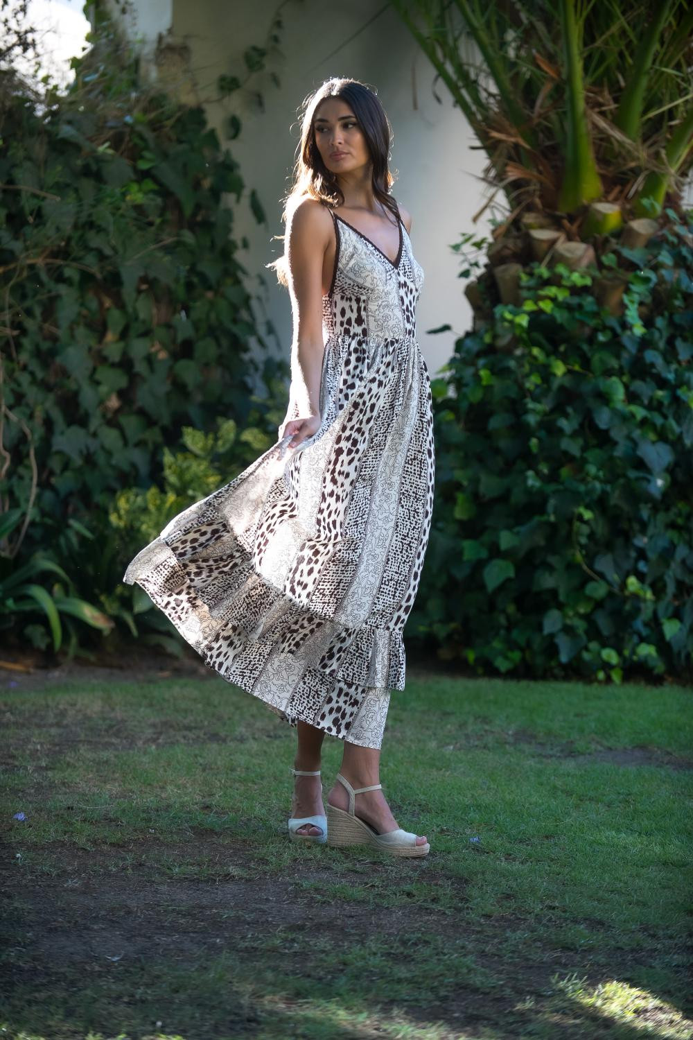 Vestido largo negro estampado Amapolas en tonos corales , fucsias , tirantes cruzados en espalda, cintura fruncida bajo pecho, falda de volantes
