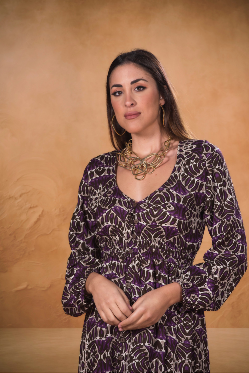 VESTIDO POZUELO ARABE EN VISCOSA LARGO CON CINTURILLA ELASTICA Y MANGA LARGA