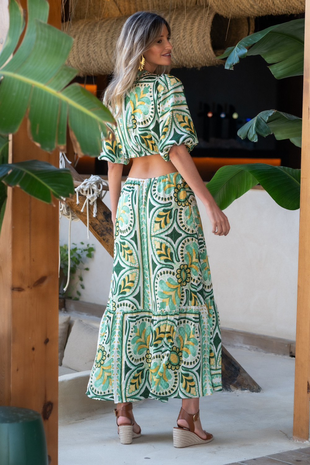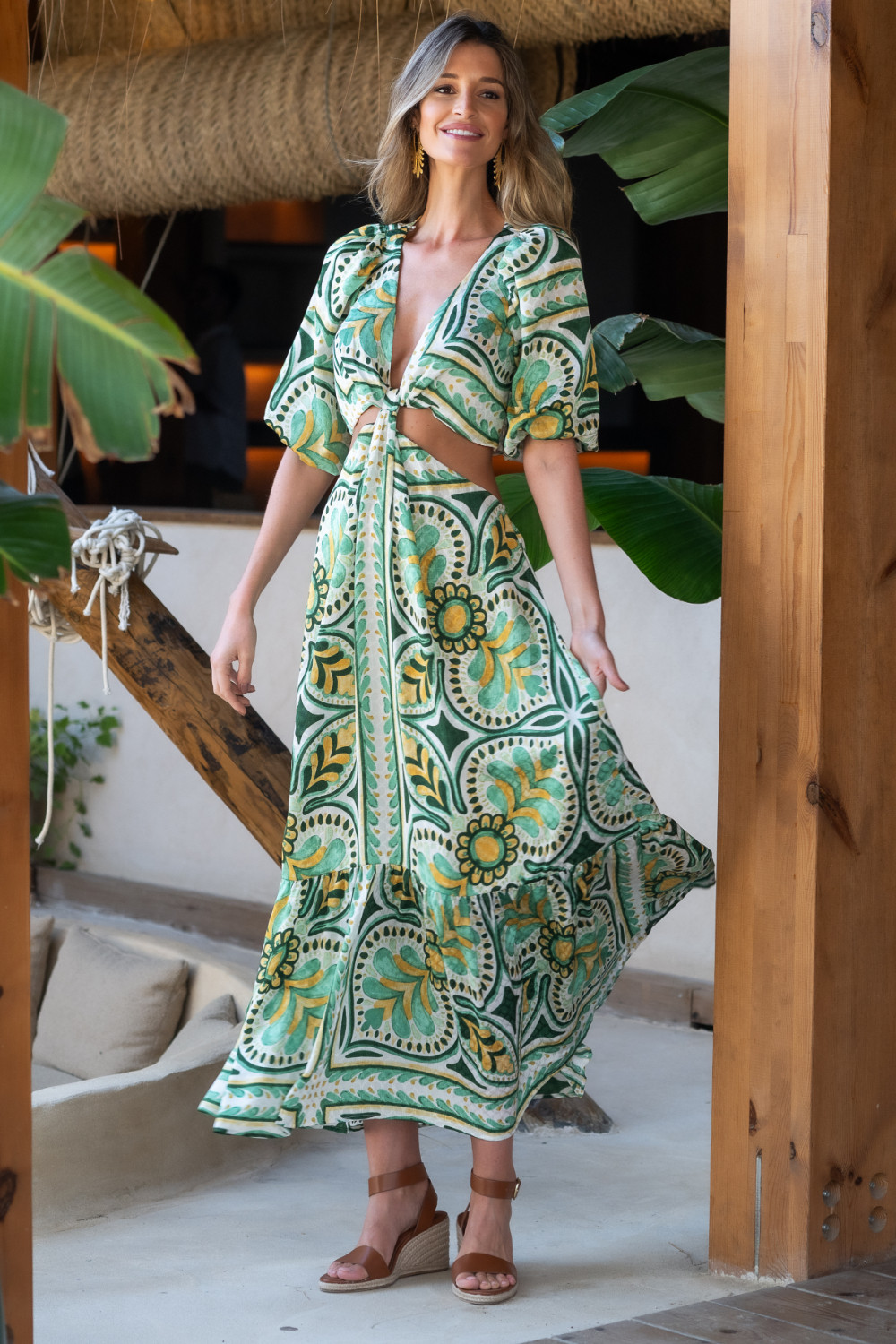 Vestido maxi con aperturas en cintura, mangas abullonadas y gran escote de pico en tonos verdes Sunset & Moon. Calidad: Exterior: 100% Poliéster - Forro:100% Poliéster