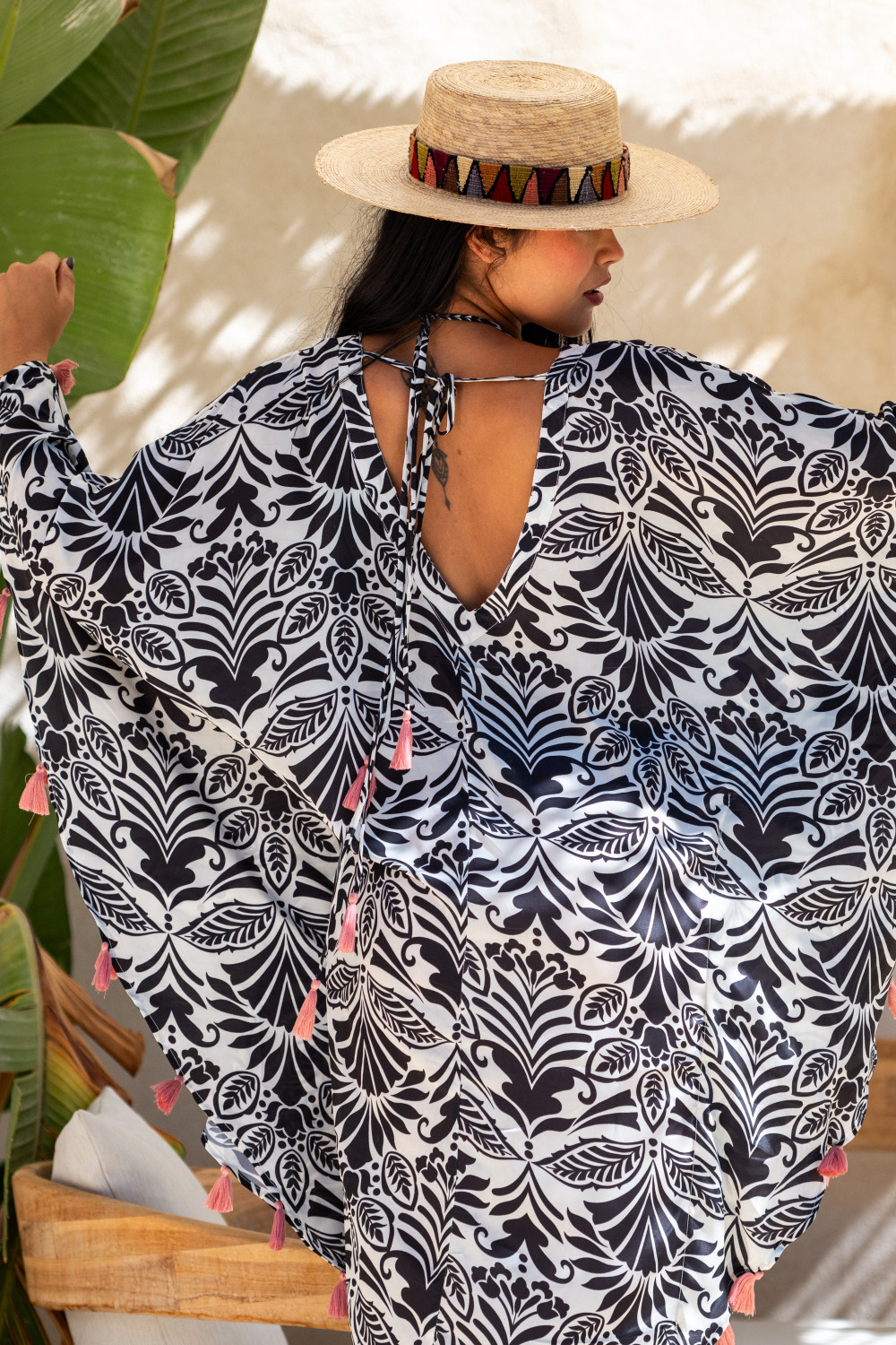 Vestido kaftan con mangas murcielago en polisilk con pompones decorativos. estampado floral en blanco y negro con los pompones en salmon Sunset & Moon. Calidad: 70% Poliéster 30% seda