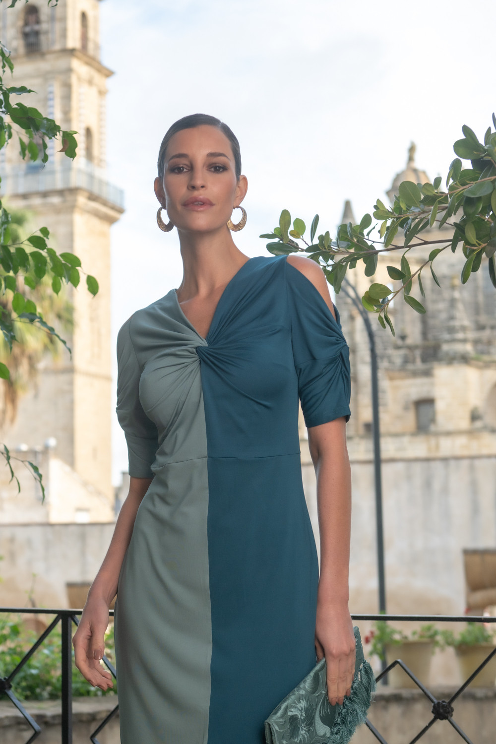 Vestido dry bicolor petróleo y verde en punto de seda con manga corta y nudo en la manga y el escote. Calidad: 95% Poliester 5% Spandex