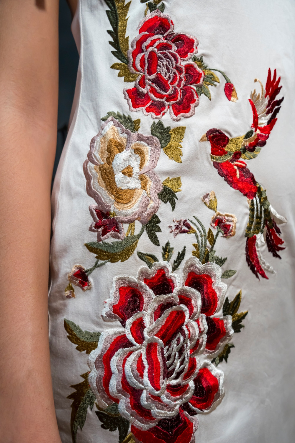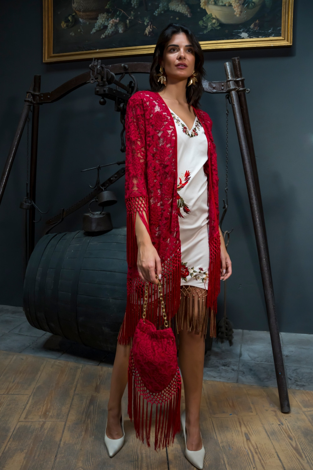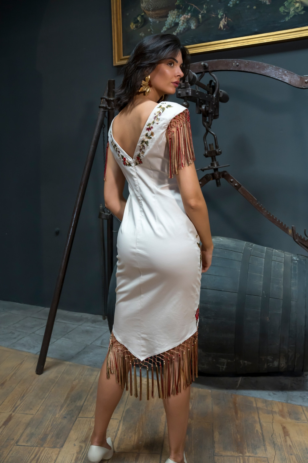 Vestido Flamenco marfil de algón lycra bordado con escote en v y flecos de colores a los tonos del bordado en la manga y el bajo Káhyra. COMPOSICIÓN: 97% ALGODÓN3% LYCRA ACCESORIOS: 100% VISCOSA